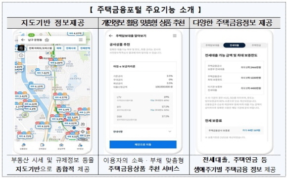 이용자의 소득 및 부채정보를 활용해 LTV 및 DSR 등을 산출함으로써 관심 주택의 주택담보대출 가능금액, 금리수준 등 확인이 가능하며 맞춤형 금융상품 추천 서비스도 제공한다.