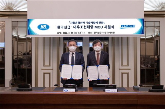 한국선급은 지난달 29일 대우조선해양과 ‘자율운항선박 기술개발을 위한 공동연구 업무협약’을 체결했다.