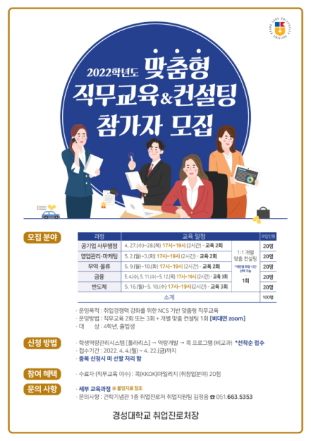 경성대학교 대학일자리플러스센터는 취업경쟁력 강화를 위해 NCS 기반 '맞춤형 직무교육&컨설팅' 교육과정을 오는 27일부터 6월 3일까지 운영한다.