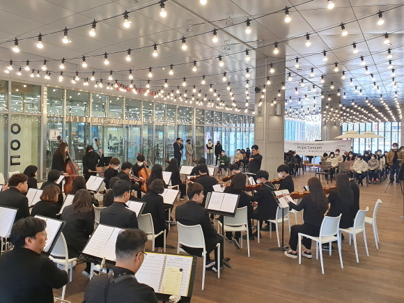 호프 콘서트는 코로나19 장기화로 지친 시민들의 마음을 달래기 위한 공연으로, 40여 명의 장애 예술인들로 구성된 사단법인 희망이룸의 오케스트라 단원들이 무대에 올랐다.
