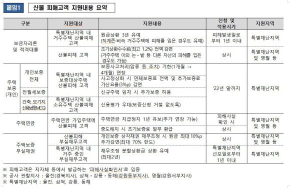 주택보증을 이용하다 대출을 갚지 못해 공사가 대신 채무를 변제한 부실채권 채무고객이 산불 피해를 입은 경우, 상각채권 채무조정 시 원금을 최대 10% 포인트 추가 감면(최대 감면율은 70%)한다. 또 이미 채무를 분할상환하고 있다면 최대 2년까지 상환을 유예한다.