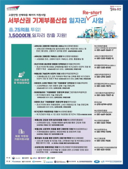 시는 7일 고용노동부와 '서부산권 부품산업 일자리 Re-Start(고용안정 선제대응 패키지 사업)' 협약을 체결하고 3개 구와 컨소시엄을 구성한 후 사업을 본격 추진한다고 밝혔다.