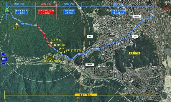 지난 2018년 대청천 생태하천 산책로와 연결되는 희망공원~장유폭포 1.26km 1단계 구간 완료에 이어 이번에 장유폭포에서 장유사 등산로 입구까지 1.2km 구간이 연장됐다.