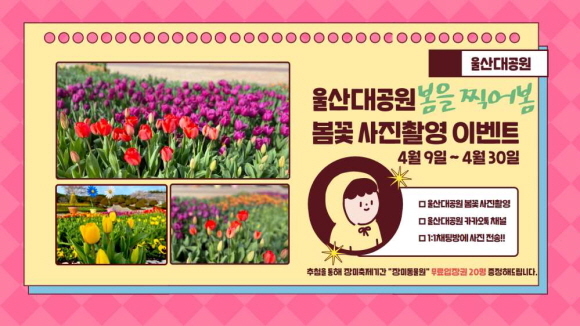 이번 행사는 튤립, 루피너스, 팬지, 수선화 등 울산대공원의 다양한 봄꽃들을 사진에 담는 이벤트로, 코로나19로 지친 시민들의 마음을 위로하고 색다른 즐거움을 선사하기 위해 기획됐다.