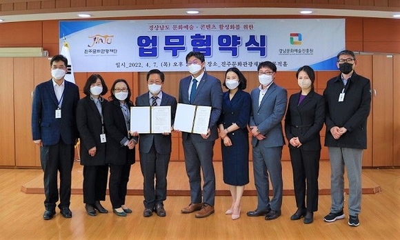 경남문화예술진흥원과 진주문화관광재단은 7일 오후 2시 진주문화관광재단 다목적홀에서 도내 문화예술 및 콘텐츠 활성화를 위한 업무협약을 체결했다.