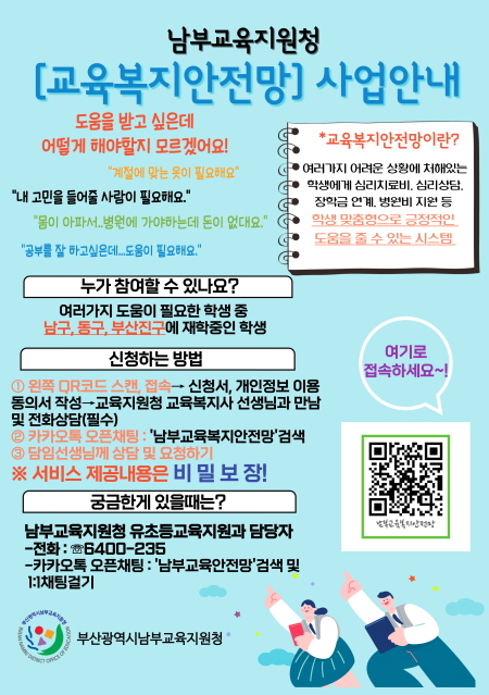 학생과 학부모들은 QR코드 스캔 또는 '남부교육복지안전망' 카카오톡 오픈채팅을 통해 신청하면 된다.
