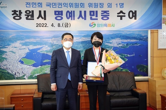 경남 창원시는 8일 접견실에서 '부산항 신항 소멸어업인 생계대책민원' 해결에 노력한 전현희 국민권익위원회 위원장과 정동률 기업고충민원팀장에게 명예시민증을 수여했다.