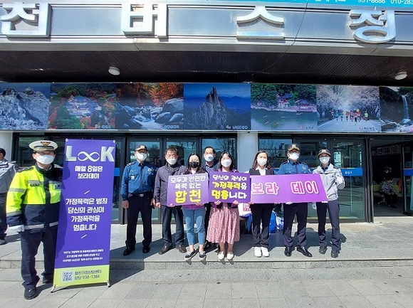 경남 합천군과 합천경찰서, 합천가정 상담센터는 8일 합천시외버스터미널과 합천군육아종합지원센터에서 민·관·경 합동으로 가정폭력과 아동학대 예방을 위한 '보라데이' 홍보 캠페인을 전개했다.