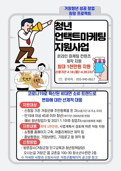 경남 거창군이 언택트 마케팅의 시대적 요구에 선제적으로 대응하고 지역 청년의 성공적인 창업을 지원하기 위해 청년 창업자 및 예비 창업자를 대상으로 오는 18일부터 20일까지 청년 '언택트 마케팅' 지원사업 참여자를 모집한다.