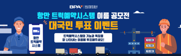 부산항만공사(BPA)는 트럭 대기시간 감소를 위해 부산항에 적용 중인 차량반출입예약시스템의 새로운 이름을 짓기 위해 오는 22일까지 2주간 대국민 투표를 진행한다고 밝혔다.