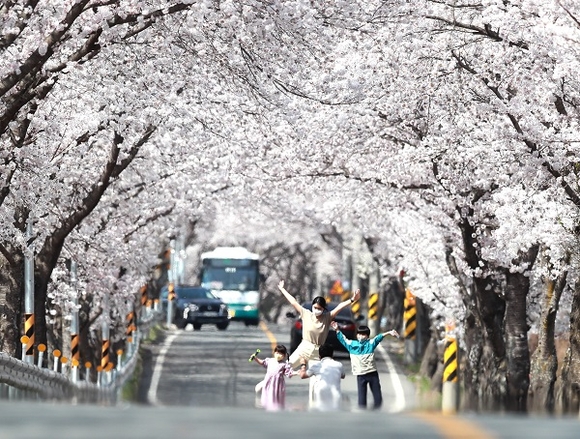 10일 경남 함양군 백전면 50리 벚꽃길을 찾은 상춘객이 만개한 벚꽃을 구경하고 있다. (사진=함양군 제공)