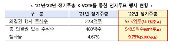 특히 국민연금이 올해 본격적으로 K-VOTE를 통해 전자투표방식으로 의결권을 행사함에 따라 주식 수 기준 전자투표행사율이 전년 대비 2배 이상 대폭 증가한 9.75%를 기록했다.