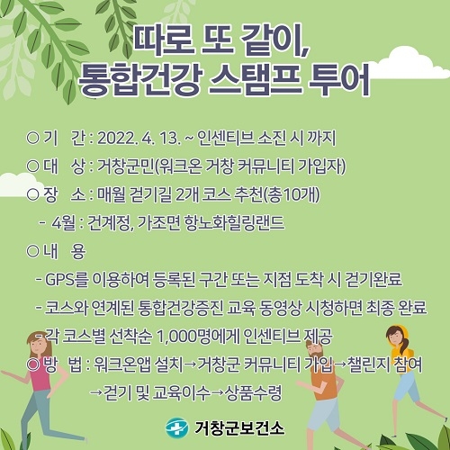 '따로 또 같이, 통합건강 스탬프 투어' 사업은 모바일 걷기 앱 '워크온'을 활용해 군내 명소를 걷고 통합건강증진 교육을 이수하면 인센티브를 제공하는 사업으로, 거창군민은 누구나 참여가능하며 구글스토어 또는 앱스토어에서 워크온 어플을 설치·가입해야 한다.