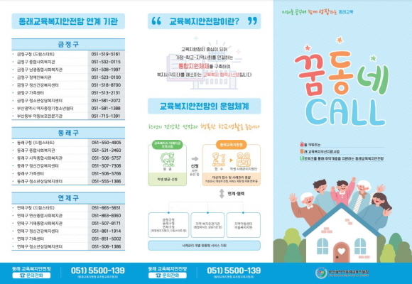 부산시동래교육지원청은 '꿈동네call' 교육복지안전망 리플릿을 제작해 관내 학교에 배포했다고 15일 밝혔다.