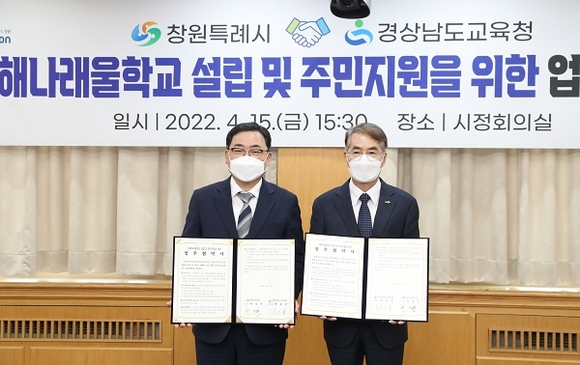 경남도교육청은 15일 오후 창원시청 시정회의실에서 창원시와 '진해나래울학교(가칭)' 설립과 설립지 주민 지원을 위한 업무협약을 체결했다.