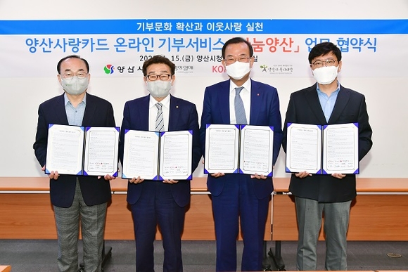 양산시는 15일 경남사회복지공동모금회, 코나아이, 양산시복지재단과 함께 양산사랑카드와 연계한 기부서비스인 '나눔양산' 운영을 위한 4자간 협약을 체결했다.