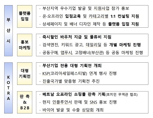 부산시가 지자체 최초로 대한무역투자진흥공사(코트라)와 공동 통상지원사업 모델을 구축해 지역 중소기업의 아세안 온라인시장 진출을 지원한다.
