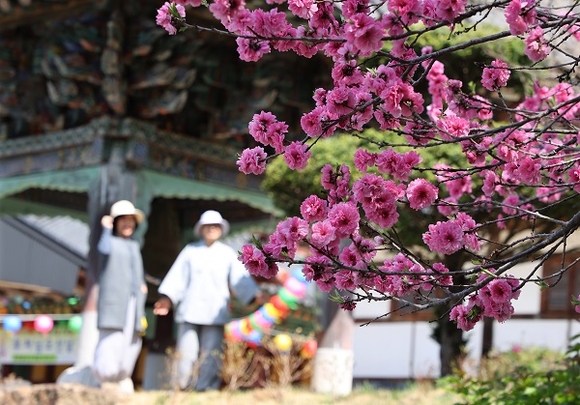 20일 지리산 자락인 경남 함양군 마천면 추성리 벽송사에서 핑크빛 겹벚꽃이 활짝 펴 있다. (사진=함양군 제공)
