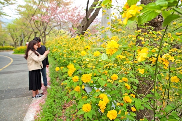 따뜻한 봄기운이 만연한 22일 경남 산청군 차황면 황매산으로 가는 길목(황매산로)에 핀 노란 황매화가 장관을 연출하고 있다. (사진=산청군 제공)