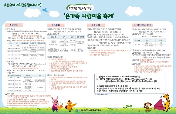 부산시유아교육진흥원이 5월 5일 어린이날을 맞아 진흥원 실·내외 체험장과 기장군 부산유아놀이꿈터 등에서 지역 3~5세 유아 가족을 대상으로 '온가족 사랑이음 축제'를 개최한다.