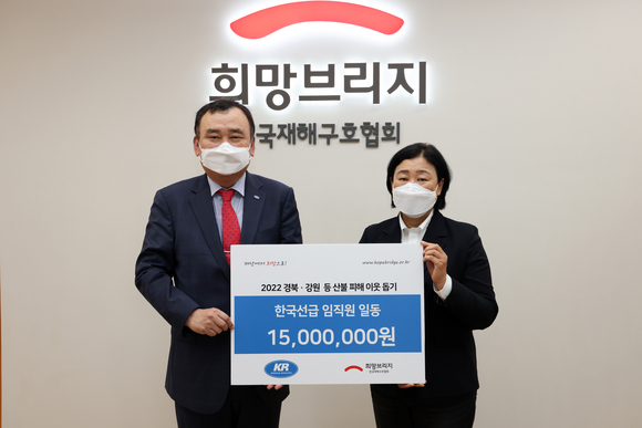한국선급(KR)은 지난 22일 경북·강원 산불 피해 복구를 위한 성금 총 1500만원을 희망브리지 전국재해구호협회에 전달했다고 밝혔다. 성금은 KR 임직원이 마련한 모금액과 KR 회사 기부금을 더해 마련됐다. 성금은 경북·강원지역 이재민 지원과 산불 피해복구에 사용될 예정이다.