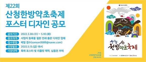 산청한방약초축제위 관계자는 “3년 연속 대한민국 정부 지정축제에 선정된 산청한방약초축제가 올해로 22회를 맞았다”며 “축제의 얼굴이라고 할 수 있는 포스터는 홍보에 중요한 역할을 한다. 축제의 의미를 잘 표현한 포스터를 선정해 축제 홍보에 적극 활용할 것”이라고 말했다.