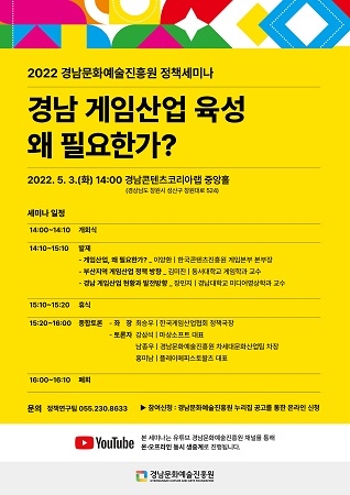 경남문화예술진흥원(이하 진흥원)은 다음 달 3일 오후 2시 경남콘텐츠코리아랩 중앙홀에서 '경남 게임산업 육성 왜 필요한가'를 주제로 정책세미나를 개최한다.