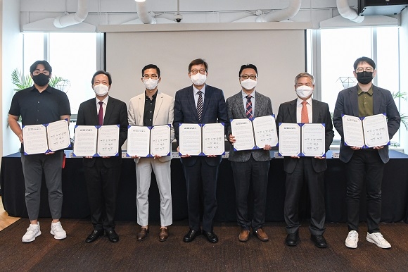 박형준 부산시장(사진 왼쪽에서 네번째)와 부산상의 장인화 회장(사진 왼쪽에서 두번째), 글로벌핀테크산업진흥센터 권기룡 이사장(사진 오른쪽에서 두번째)이 26일 미래 신산업, 핀테크 강소기업을 키우기 위한 'S-Space 업무 협약'을 체결하고 기념 촬영을 하고 있다. (사진=부산시 제공)