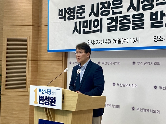 더불어민주당 변성완 부산시장 예비후보는 27일 시의회 브리핑룸에서 기자회견을 열고 "박형준 시장은 시장직을 그만두고 시민의 검증을 받아야 한다"고 촉구하는 한편, 가덕신공항 2029년 개항을 위한 초당적 협력 회동을 제안했다.