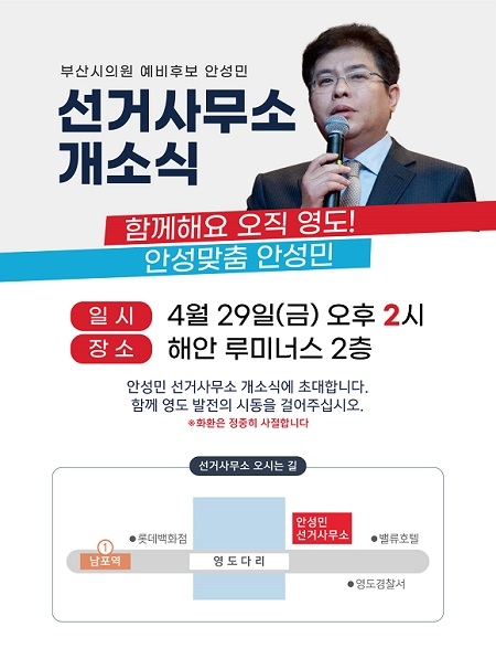 4선에 도전하는 안성민 국민의힘 부산시의원 예비후보가 오는 29일 오후 2시 부산 영도구 해안 루미너스 2층에서 선거사무소 개소식을 갖는다.
