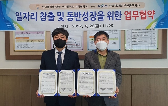한국마사회 부산동구지사는 지난 22일 한국폴리텍대학 부산캠퍼스 산학협력처와 '일자리창출 및 동반성장' 업무협약(MOU)을 체결했다.