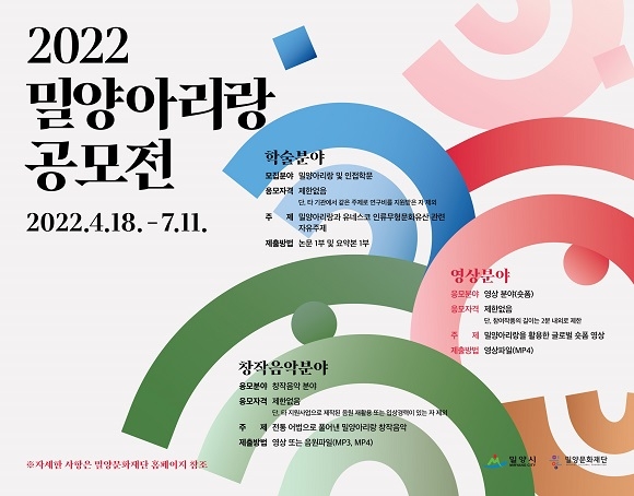 밀양문화재단이 '밀양아리랑'과 관련한 우수 콘텐츠 확보와 글로벌 브랜드 경쟁력 강화를 위한 '2022 밀양아리랑 공모전'을 오는 7월 11일까지 진행한다.