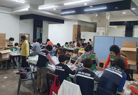 신속항원키트는 20개 묶음과 이용자 편의를 위해 2개 묶음 개별 포장으로 지원된다. 창원시 지역자율방재단과, 주부민방위기동대가 소분해 재포장하는 작업에 참여했다.