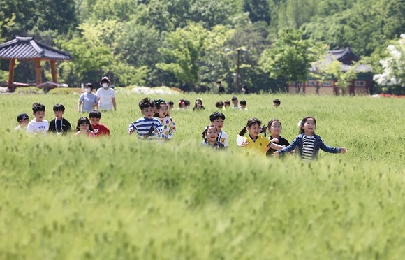어린이날을 이틀 앞둔 3일 경남 함양군 상림공원 청보리밭을 찾은 연꽃어린이집 원생들이 청보리밭을 걸으며 즐거운 시간을 보내고 있다. (사진=함양군 제공)