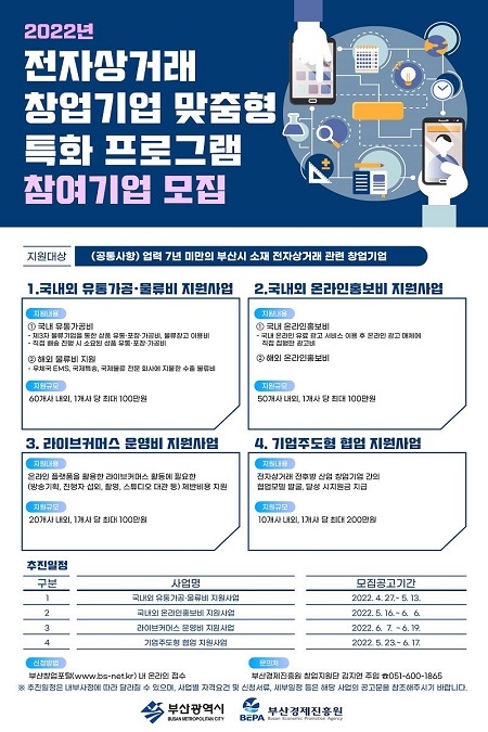 부산시는 부산경제진흥원과 함께 '전자상거래 창업기업 맞춤형 특화 프로그램' 참여기업을 모집한다고 4일 밝혔다.