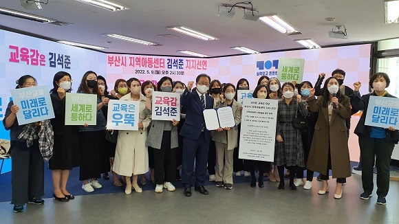 부산시 지역아동센터 돌봄운동본부장과 지역아동센터장, 종사자, 학부모, 자원봉사자 등 355명이 9일 김석준 부산시교육감 예비후보 지지를 선언했다.