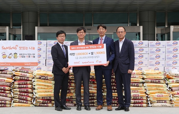경남 밀양시는 11일 삼양식품과 삼양원동문화재단에서 밀양공장 준공식을 기념해 2천만원 상당의 삼양라면 1000박스, 쌀 1.9톤을 기탁했다고 밝혔다.