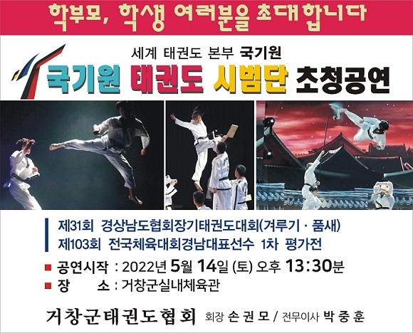 특히 이번 대회에는 세계 최고의 권위를 자랑하는 대한민국 국기원 태권도시범단의 특별공연이 예정돼 있으며, 이동섭 국기원장과 김오영 경남생활체육회장이 직접 대회장을 방문하여 경남 태권도인들의 자부심을 높이는 장이 될 것으로 보인다.