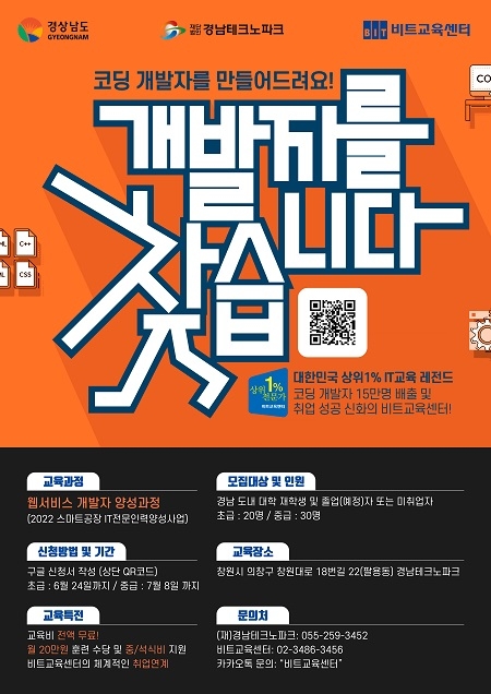 한편 교육과정에 대한 자세한 내용은 경남TP 홈페이지와 포스터의 QR코드에서 확인할 수 있으며, 전화상담(경남TP 인재개발팀 또는 비트컴퓨터 교육센터)을 통해 교육과정에 신청할 수 있다.