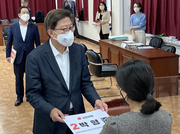 박형준 부산시장 후보가 12일 오전 9시 30분 부산시선거관리위원회에서 후보자 등록을 하고 있다. 박 후보는 지난 1년간 부산시정을 이끌어 왔다. 이번 재선 도전에서 변성완 더불어민주당 부산시장 후보와 맞붙는다.