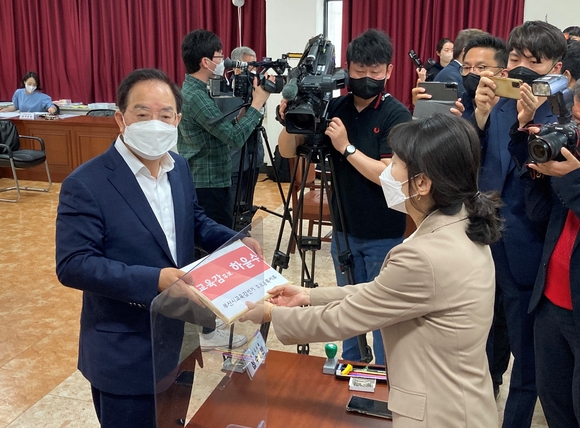 하윤수 부산시교육감 후보가 12일 오전 9시 30분 부산시선거관리위원회에서 후보자 등록을 하고 있다. 하 후보는 36대, 37대 교총 회장을 역임하고, 이번 선거에 처음 출마한다. 3선에 도전하는 김석준 후보와 맞붙는다.