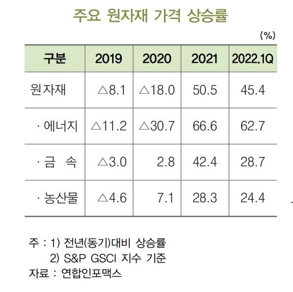 2021년 글로벌 원자재 가격은 전년 대비 50.5% 급등하며 최근 10년 중 가장 높은 상승률을 기록한 것으로 조사됐다. 올해 1분기에도 전년 동기 대비 45.4% 오르며 상승흐름이 지속되고 있는 것으로 나타났다.