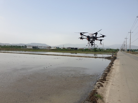 김해시농업기술센터는 드론을 이용한 벼 직파재배 신기술 확대 보급한다고 13일 밝혔다.