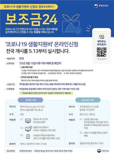 한편 코로나로 입원·격리 통지서를 받은 시민은 격리해제 후 3개월 이내 생활지원비 신청을 할 수 있고 가구내 격리자가 1인이면 10만원, 2인 이상인 경우 15만원이 지급되며 공공기관 및 국가·지차체 등의 재정지원을 받는 기관 또는 학교등의 종사자, 유급휴가를 받은자, 해외입국 격리자, 격리·방역수칙 위반자는 지원이 제외된다.