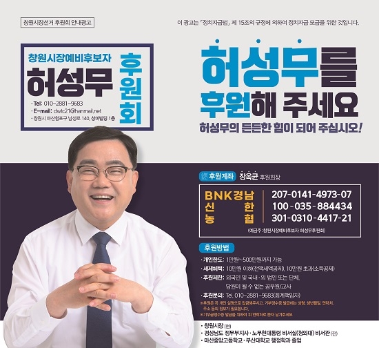 허성무 더불어민주당 창원시장 후보 선거사무소는 깨끗하고 투명한 선거를 치르는 데 필요한 선거비용을 모금하기 위한 '허성무 펀드' 모집이 16일 낮 12시 개설 2시간 만에 마무리됐다고 밝혔다.