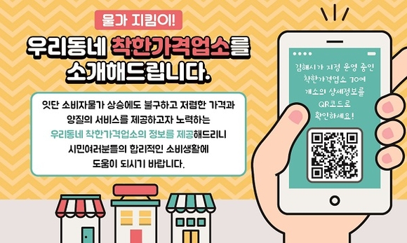 김해지역 70개의 착한가격업소 현황은 시 누리집에서 확인할 수 있으며, 이외에도 시는 물가안정 동참업소, 단체손님 가격할인업소 등 가격모범업소를 매년 수시로 발굴해 인센티브를 제공하고 있다.