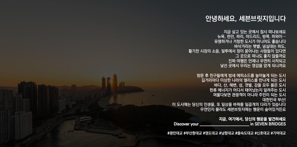 지난 9월 착수한 세븐브릿지 프로젝트는 부산 대표 7개의 해양 교량자원 분석하고, 브랜드 메시지 'Discover your ____in SEVEN BRIDGES'를 통해 7개의 다리로 연결된 부산에서 자신만의 행운을 찾아볼 것을 제안하는 프로젝트다.