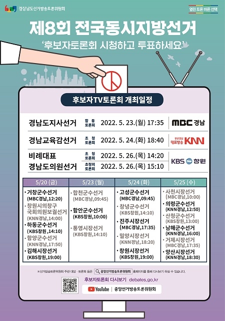 경남도선거방송토론위원회는 오는 20일부터 26일까지 제8회 전국동시지방선거 및 창원시의창구국회의원보궐선거 후보자토론회를 연다고 밝혔다.