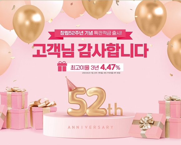 최명희 마케팅추진부장은 “창립 52주년 기념 특판 정기적금을 통해 2만명에게 최대 4.47% 금리를 제공하고자 한다. 고객님 감사합니다라는 제목으로 특별 판매될 정기적금에 고객과 지역민들이 많은 관심을 가져주기를 바란다. 창립 52주년 기념 특판 정기적금과 각종 이벤트를 통해 감사의 마음이 잘 전달되기를 희망한다”고 말했다.