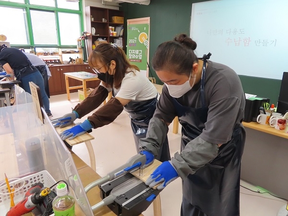 '나만의 간이수납함 만들기'를 주제로 공구 사용법과 아이디어 스케치, 레이저커터 장비 사용, 작품 제작 실습 등에 대한 안전교육이 실시된다.